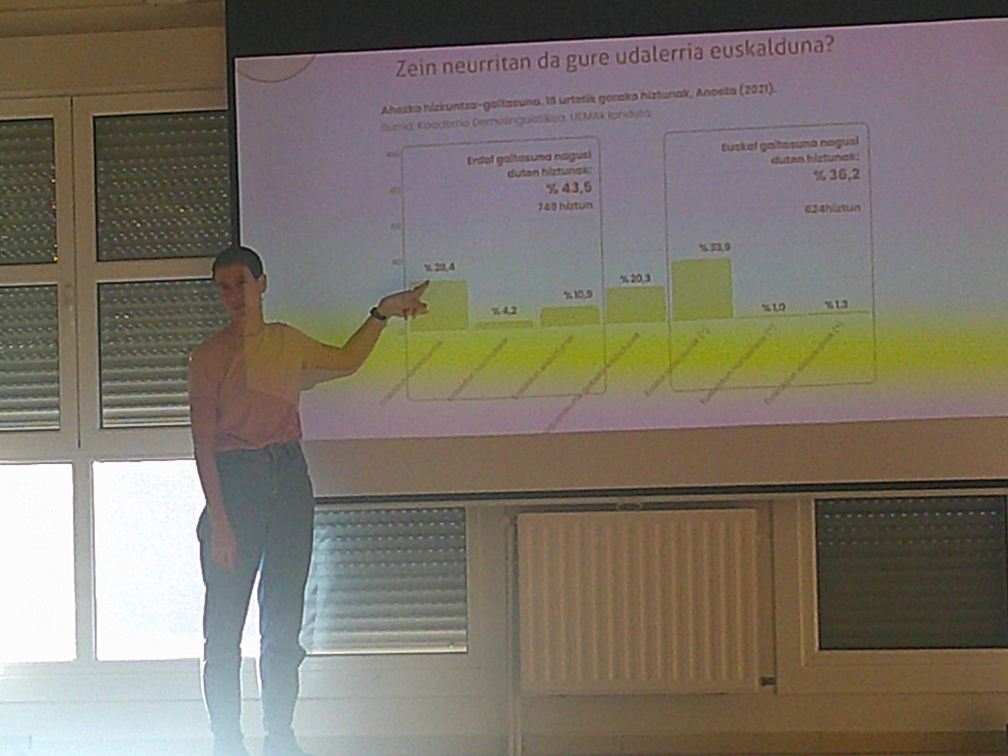 Aste honetan egindako saioan, Anoetako datu soziolinguistikoak aztertu genituen, euskararen erabilerak testuinguruaren arabera dituen erronkak agerian utziz. Ondoren, ikasgelako hizkuntza-ohiturak eta euskararen presentzia hausnartu genuen modu parte-hartzailean. Tailerrean hainbat aholku praktiko landu ziren, hala nola irakasleen eredugarritasuna eta euskarazko giro segurua sortzea. Halaber, ikasleen motibazioa eta hizkuntza-kontzientzia lantzearen garrantzia azpimarratu zen. Eguneroko egoera txikietan ere euskarari eusteko estrategiak proposatu ziren. Ondorio nagusi gisa, komunitate osoaren inplikazioa eta koherentzia direla euskararen erabilera sendotzeko giltzarriak ondorioztatu genuen.